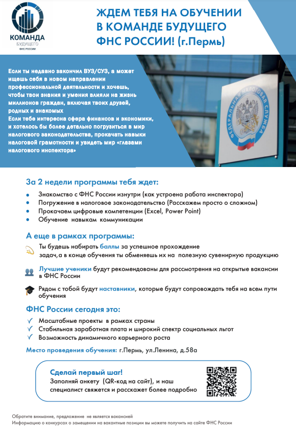 Управление Федеральной налоговой службы по Пермскому краю сообщает о проведении в октябре 2024 года пилотного обучающего проекта ФНС России «Команда будущего», ориентированного на выпускников (юридических и экономических специальностей) высших и средних учебных заведений.