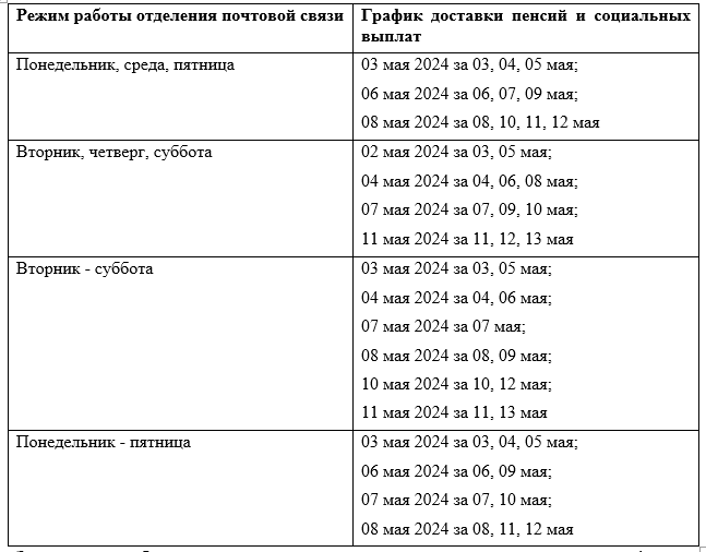 Организациями почтовой связи, доставляющими пенсии и социальные выплаты на дом, доставка будет осуществляться со 2 мая 2024 года в соответствии с установленным графиком и с учетом режима работы отделений почтовой связи.
