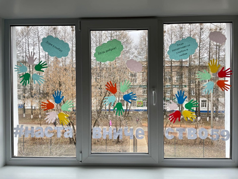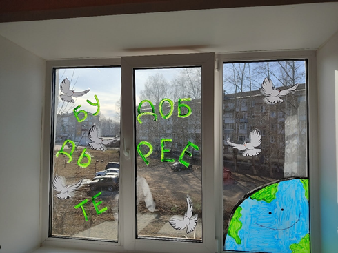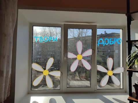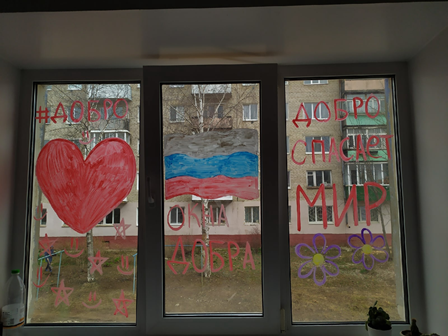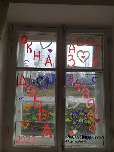 Город Кудымкар присоединился к акции #ОкнаДОБРА2022 при участии КДН и ЗП города Кудымкара и несовершеннолетних проживающих в ГБУ «Управление общежитиями СПО Пермского края по адресам: г. Кудымкар, ул. Леваневского 1а, ул. Плеханова 25, ул. Плеханова 28, ул. Плеханова 24/3, ул. Лихачева 59, наставник Евгения Минина с наставляемым Василием оформили окна с добрыми мыслями и хэштегами.