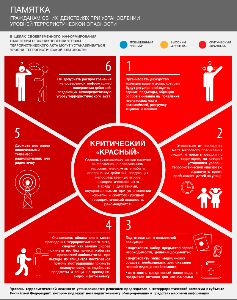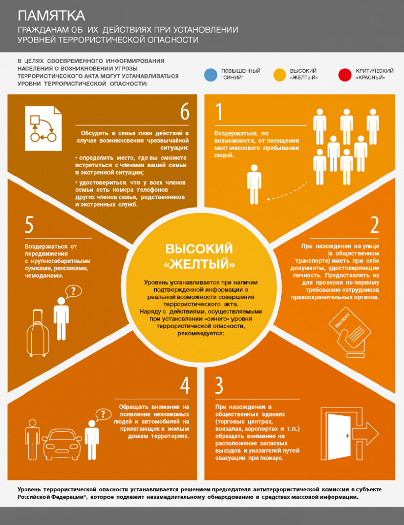 В соответствии с Федеральным законом от 6 марта 2006 г. № 35-ФЗ «О противодействии терроризму» в целях своевременного информирования населения о возникновении угрозы террористического акта и организации деятельности по противодействию его совершению, осуществляемой Национальным антитеррористическим комитетом во взаимодействии с федеральными органами исполнительной власти, органами государственной власти субъектов Российской Федерации, органами местного самоуправления и в соответствии с указом Президента Российской Федерации от 14 июня 2012 г. № 851 могут устанавливаться уровни террористической опасности, предусматривающие принятие дополнительных мер по обеспечению безопасности личности, общества и государства.