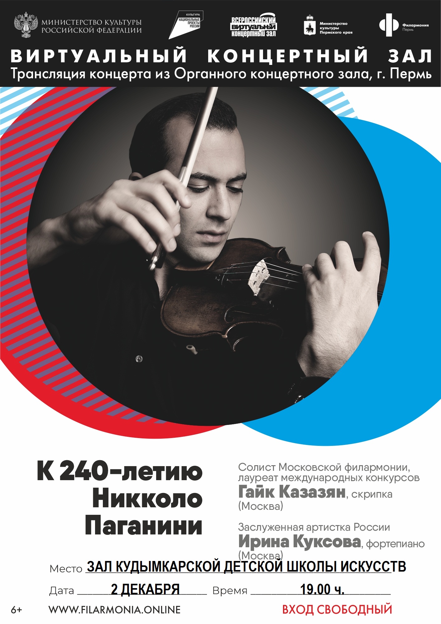 2 декабря в 19 часов вас ждет потрясающий вечер музыки Паганини в исполнении настоящих виртуозов. Программу, посвящённую 240-летию со дня рождения Никколо Паганини, представит всемирно известный скрипач, солист Московской государственной академической филармонии, лауреат международных конкурсов Гайк Казазян. За роялем — заслуженная артистка России Ирина Куксова.