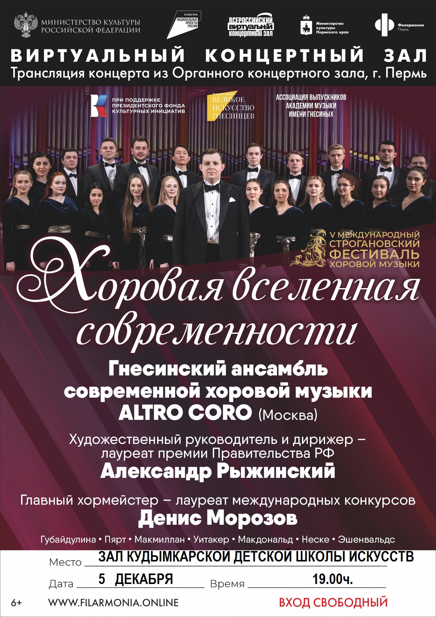 5 декабря в 19 часов состоится трансляция концерта Ансамбля современной хоровой музыки «Altro coro» под управлением ректора Российской академии имени Гнесиных, профессора Александра Рыжинского.