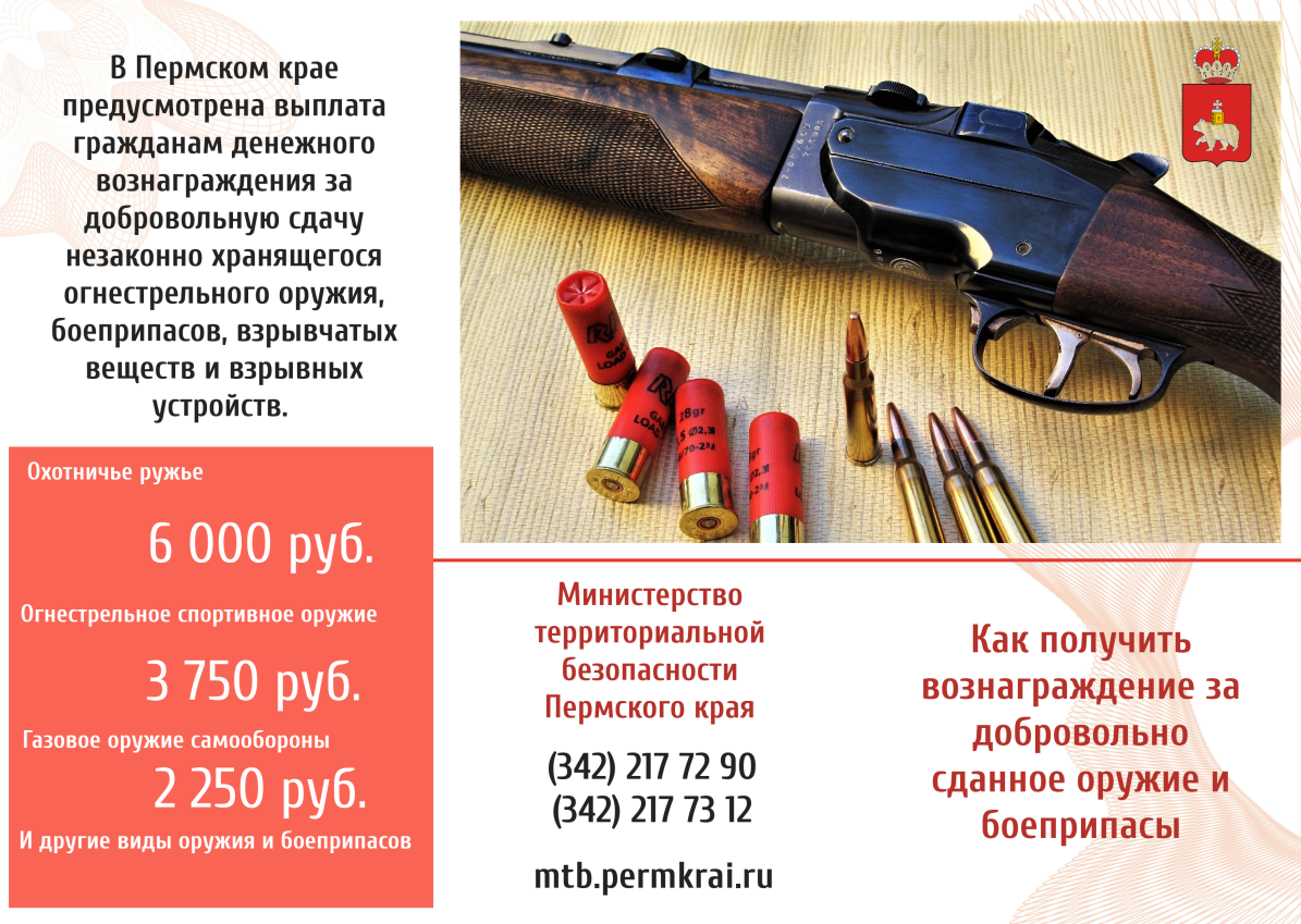 Размеры денежного вознаграждения гражданам за добровольную сдачу основных видов вооружения согласно постановления Правительства Пермского края от 16.07.2019 № 492-п. Например, за охотничье ружье можно получить 6 тыс. руб., огнестрельное спортивное оружие – 3750 руб., газовое оружие самообороны – 2250 руб. полный перечень можно уточнить в Министерстве территориальной безопасности Пермского края.