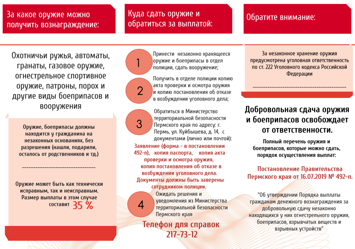 · для выплаты вознаграждения представить в Министерство территориальной безопасности Пермского края, расположенного по адресу: Пермский край, г. Пермь, ул. Куйбышева, д. 14, заказным почтовым отправлением с описью вложения или лично следующие документы: заявление; копию документа, удостоверяющего личность; копию акта проверки и осмотра оружия, выданную отделом полиции, копию постановления об отказе в возбуждении уголовного дела.