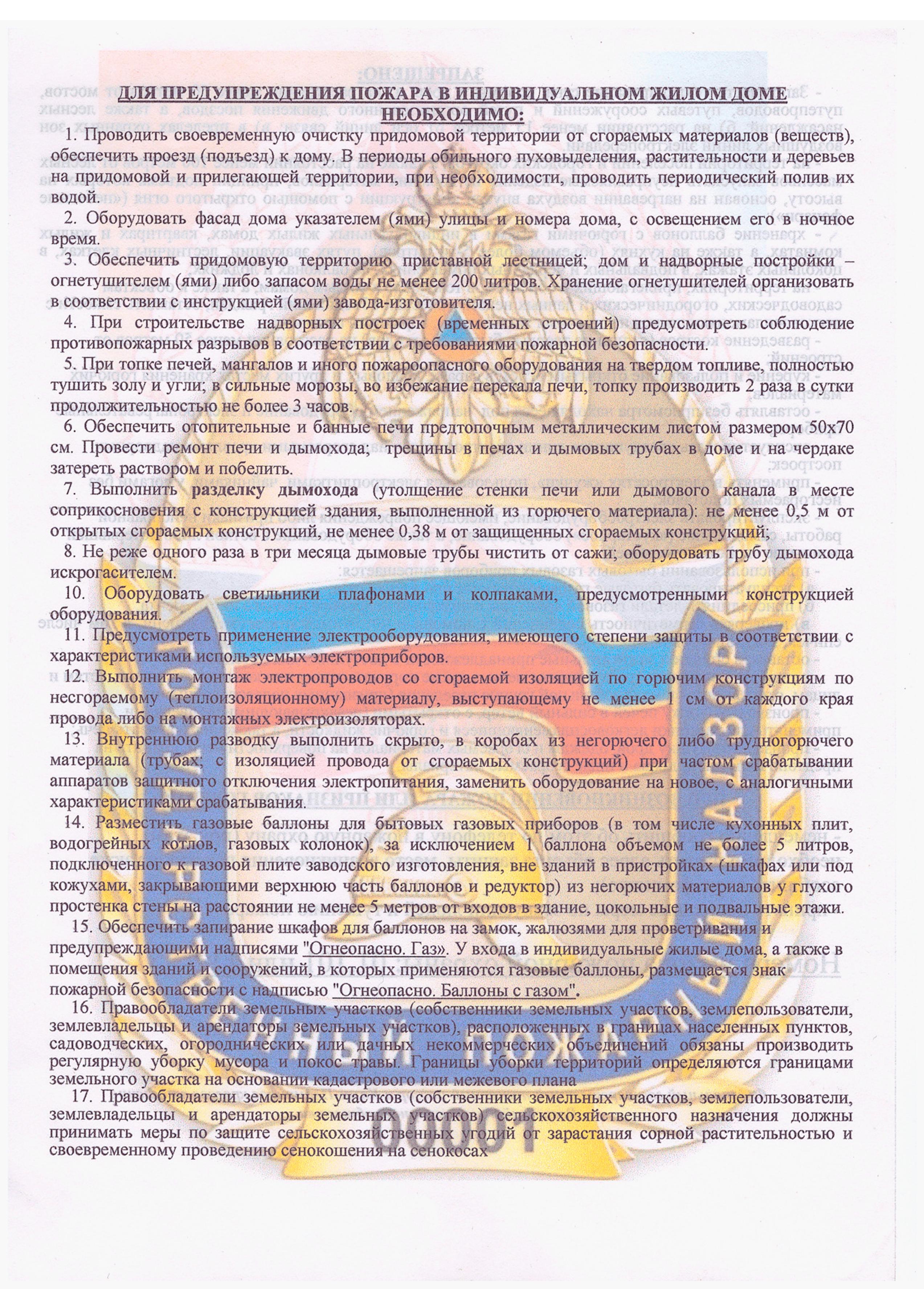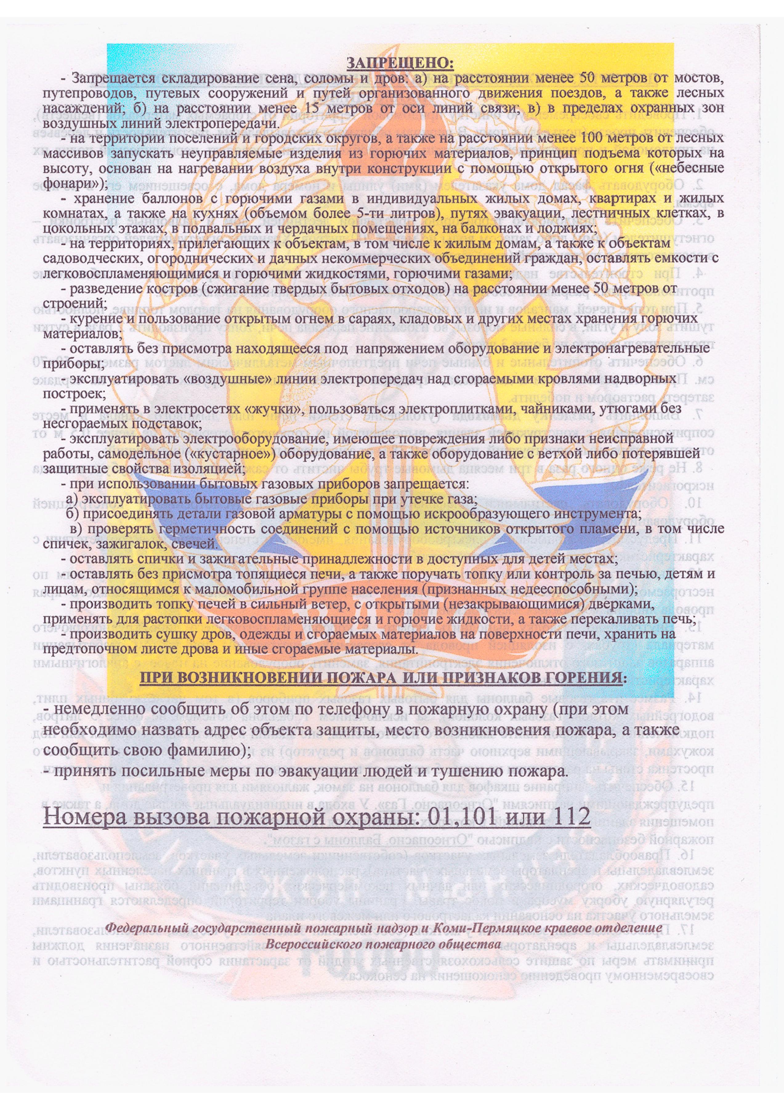 Содержите в исправном состоянии отопительные, электронагревательные приборы и электрическую проводку. Не ставьте нагревательные приборы вблизи воспломеняющихся предметов, не перегружайте электросеть, не допускайте перекала отопительной печи.