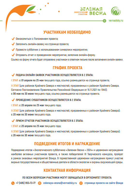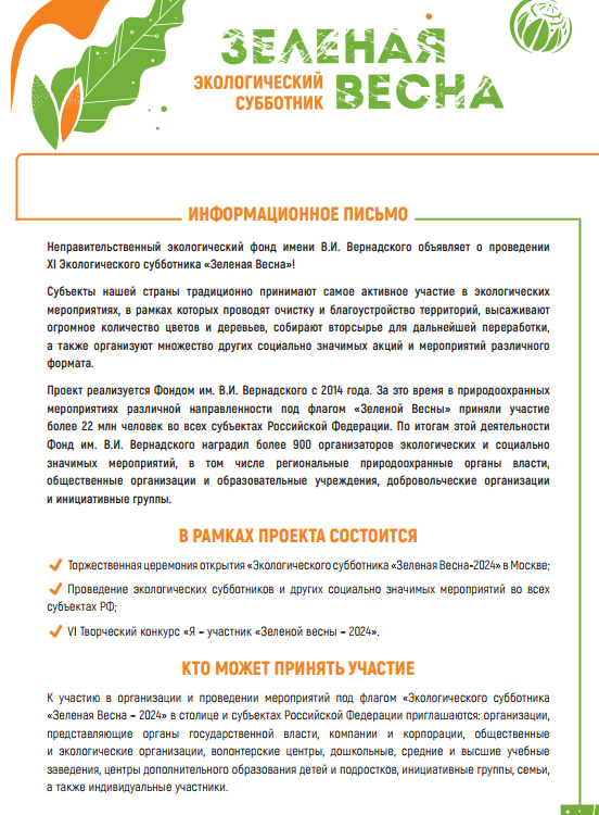 Подведение итогов экологического субботника «Зеленая Весна – 2024» и награждение участников, показавших наиболее значимые результат, состоится в рамках торжественных мероприятий Фонда им. В.И. Вернадского.