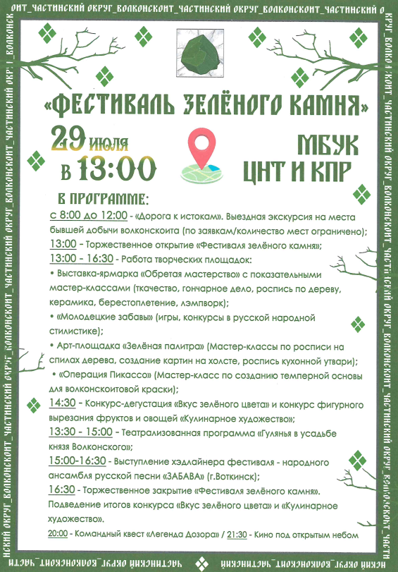29 июля в селе Частые Частинского муниципального округа пройдет уникальный, коллаборативный «Фестиваль зелёного камня». Это эксклюзивное event-мероприятие, которое посвящено природному наследию нашей Родины, а именно волконскоиту -
