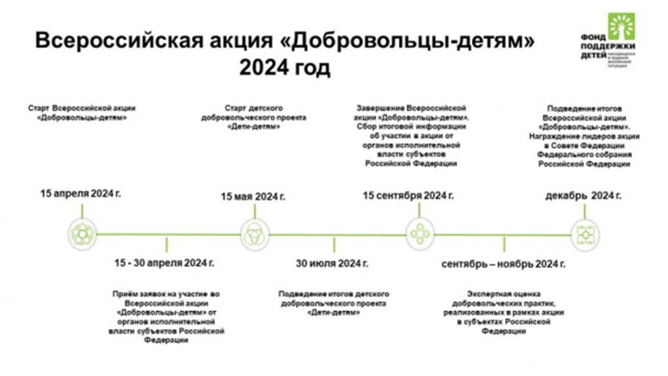 Фонд поддержки детей, находящихся в трудной жизненной ситуации объявил о проведении в период с 15 апреля по 15 сентября 2024 года XIII Всероссийской акции «Добровольцы – детям».