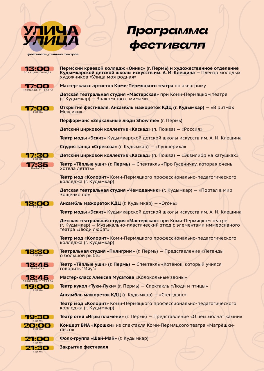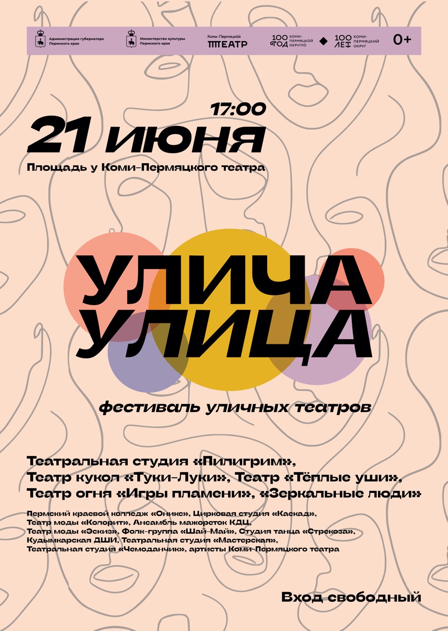 21 июня 2025 года на площади перед Коми-Пермяцким национальным драматическим театром состоится Первый фестиваль уличных театров «Улича-Улица» (0+).