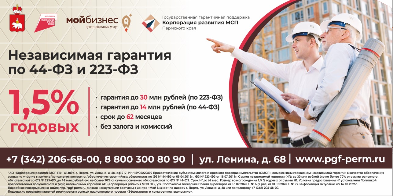 Уважаемы предприниматели! АО «Корпорация развития МСП ПК» информирует о возможности получения независимой гарантии предпринимателями Прикамья, в целях повышения конкурентоспособности и доступности малого и среднего бизнеса Пермского края к государственным и муниципальным закупкам в рамках 44-ФЗ, а также коммерческим закупкам в рамках 223-ФЗ. Подробная информация размещена на сайте pgf-perm.ru, личные консультации доступны в центре «Мой Бизнес» по адресу г. Пермь, ул. Ленина, д. 68 или по телефону 8(342) 206-68-00.