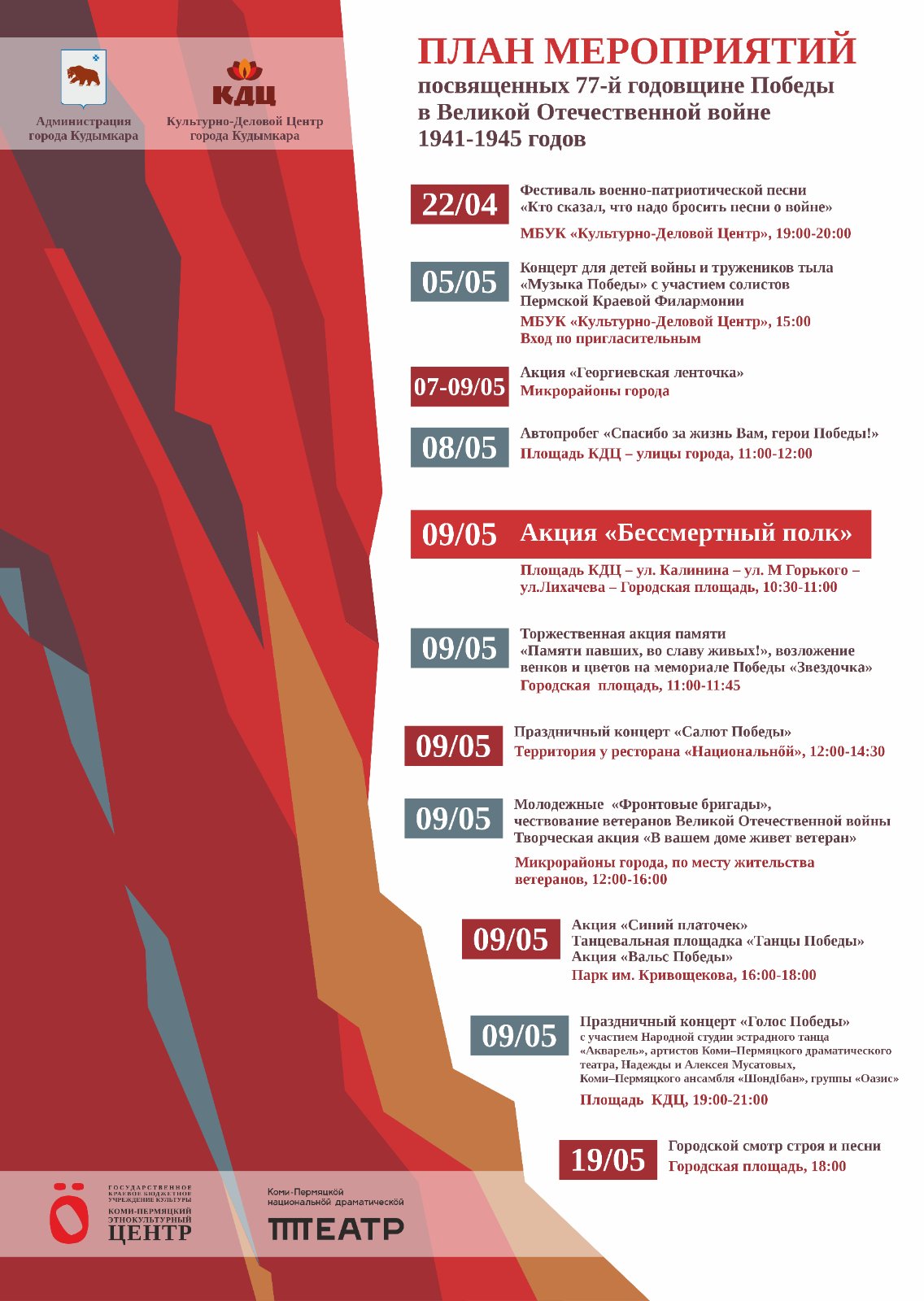 Напомним, что что в преддверии празднования Дня Победы в Кудымкаре состоялся Фестиваль военно-патриотической песни «Кто сказал, что над бросить песни о войне», а 5 мая в Культурно-Деловом Центре для детей войны и тружеников тыла прошел праздничный концерт.