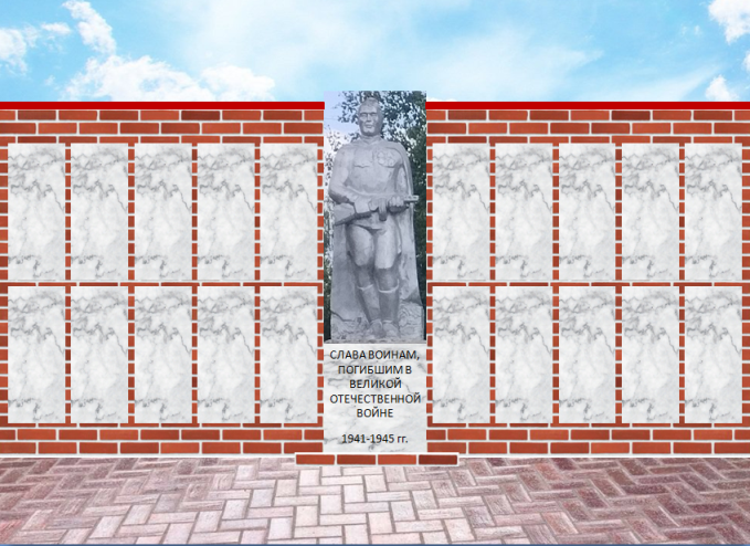 -строительство стен с обеих сторон для установки мраморных плит с фамилией и инициалами всех погибших в ВОВ Ошибской территории;